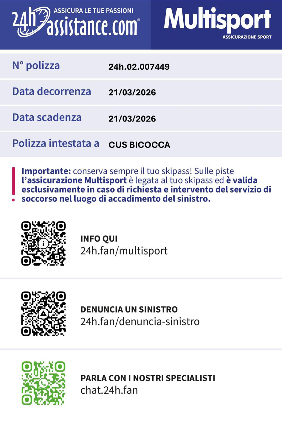 In caso di intervento da parte dei soccorsi è necessario comunicare il N° della polizza: 24h.20.007449 intestata a CUS Bicocca